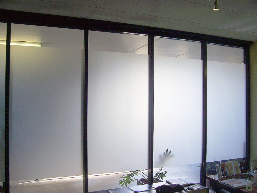 Window Frosting is a film applied to windows. It has minimal Ultraviolet protection, while allowing all natural ambient light to shine through.